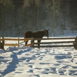 Keywords: horse fence farm winter prairies snow shadows footprints rails pasture