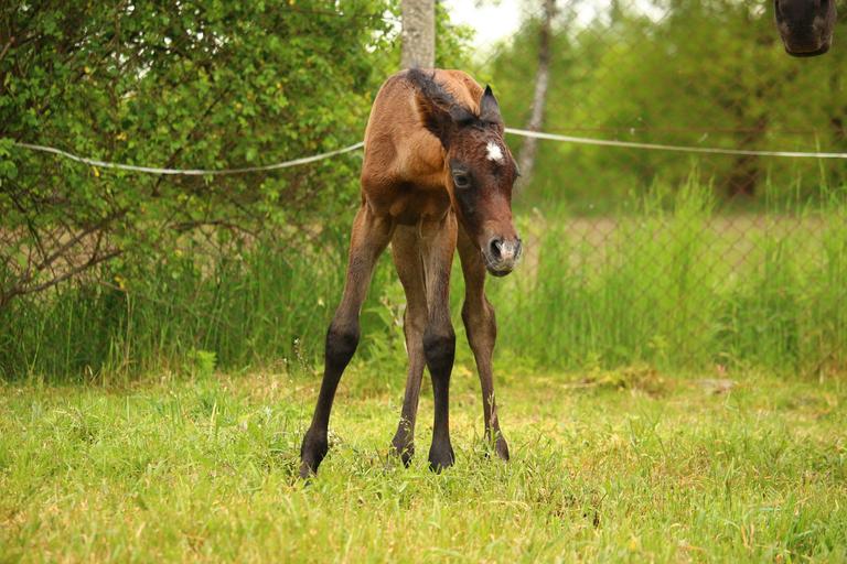 Keywords: horse foal brown mold suckling thoroughbred arabian pasture