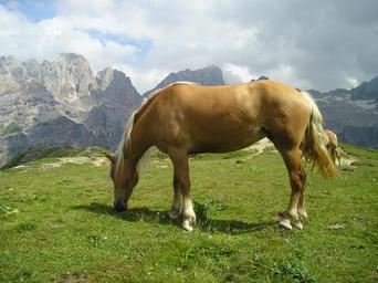 Keywords: horse graze pasture brown haflinger mare stallion dolomites mountains alpine south tyrol italy animal nature mammal fur