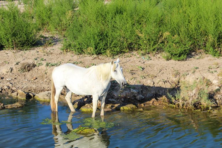 Keywords: horse nature water river channel bach hippopotamus wild horse camargue south of france france provonce south mediterranean green white blue sand earth plant shrubs