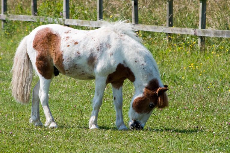 Keywords: horse pony grazing pretty equine animal eating shetland pony pet brown white grass cute beautiful