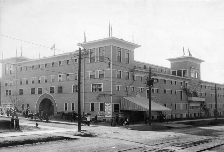 Keywords: monochrome blackandwhite outdoor architecture building black and white Horse Show Building on the SW corner of West Georgia and Gilford Streets. 1910 photograph. Built 1909 (although some sources claim 1898). Converted to an armoury for the Irish Fusiliers in 1914. Also known as the Stanley Park Armouries, the wooden structure burned to the ground on March 18, 1960. [City of Vancouver Archives; W.J. Cairns, photographer] Horse Show Building on the SW corner of West Georgia and Gilford Streets. 1910 photograph. Built 1909 (although some sources claim 1898). Converted to an armoury for the Irish Fusiliers in 1914. Also known as the Stanley Park Armouries, the wooden structure burned to the ground on March 18, 1960. [City of Vancouver Archives; W.J. Cairns, photographer] |