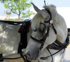 Keywords: horse white blinders harness head carriage street ride eye brown bridle