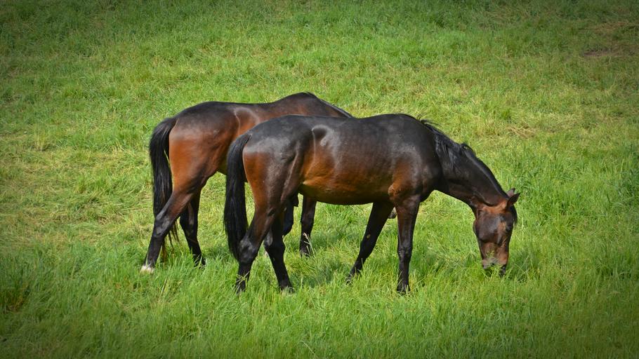 Keywords: horses flock coupling ride animals pasture brown graze wildlife mammal
