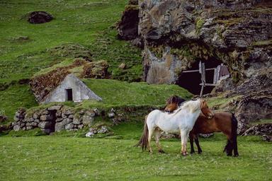 Keywords: horses pasture farm abandoned building hut shed shelter barn green meadow animal mammal stallion rural field ranch equine grass countryside