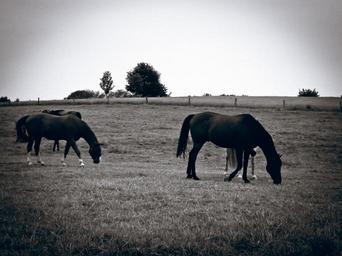 Keywords: horses pasture graze coupling nature grass brown horse pasture black white
