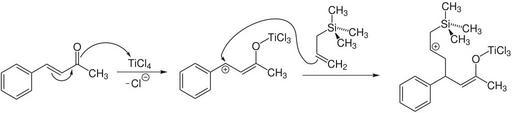 Keywords: Hosomi-Sakurai-Mechanismus 1.svg en Mechanism of the Hosomi-Sakurai-Reaction part 1 de Reaktionsmechanismus der Hosomi-Sakurai-Reaktion erster Teil own Bjö Kra 2011-09-12 Cc-zero Sakurai reaction Reaction mechanisms