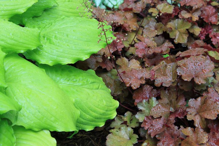 Keywords: hosta coral bells garden organic green purple rain wet background nature texture spring summer plant shade foliage