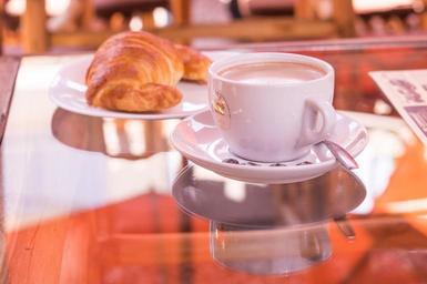 Keywords: hot chocolate breakfast drink cup beverage brown food mug morning pastry table croissant reflection restaurant cocoa