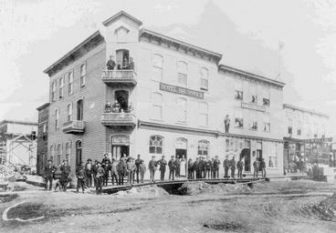 | Keywords: architecture crowd ottawa house ottawahouse hotels construction cumberland street cumberlandstreet port arthur portarthur hotel brunswick hotelbrunswick thunder bay thunderbay businesses lincoln street lincolnstreet ontario canada history blackandwhite monochrome outdoor building black and white Date: c. 1880s Description: Two of Thunder Bay’s earliest hotels, the Hotel Brunswick and the Ottawa House of South Cumberland Street, succumbed to a disastrous fire in February, 1886. The Ottawa House was rebuilt two year later using brick construction (in an attempt to make it fire-proof), and an addition in 1901 extended the hotel to the corner of Lincoln Street. The truncated corner and balconies of the addition give a nod to the early design. The building, handsomely restored some 25 years ago, still exists today. Accession No.: 972.1.58 Date: c. 1880s Description: Two of Thunder Bay’s earliest hotels, the Hotel Brunswick and the Ottawa House of South Cumberland Street, succumbed to a disastrous fire in February, 1886. The Ottawa House was rebuilt two year later using brick construction (in an attempt to make it fire-proof), and an addition in 1901 extended the hotel to the corner of Lincoln Street. The truncated corner and balconies of the addition give a nod to the early design. The building, handsomely restored some 25 years ago, still exists today. Accession No.: 972.1.58 |