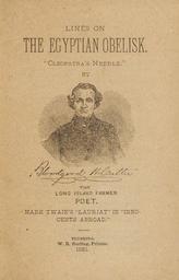 | Keywords: Houghton AC85 C9814 881â„“ - Egyptian Obelisk, title.jpg en Title page Lines on the Egyptian obelisk Cleopatra ™s Needle Flushing W R Burling 1881 By Bloodgood H Cutter 1817-1906 Includes portrait of the author Scan of full book available http //id lib harvard edu/aleph/005100736/catalog AC85 C9814 881 „“ Houghton Library Harvard University 1881 http //id lib harvard edu/aleph/005100736/catalog AC85 C9814 881 „“ Houghton Library Harvard University<br /> institution Houghton Library Bloodgood Cutter author This is a media file that Houghton Library believes to be in the public domain of the United States This applies to a work published before January 1 1923 or the unpublished work of an author who died more than 70 years ago Houghton Library and Harvard University claim no rights in this photographic reproduction of the work and the image is free to download and reproduce for any use commercial or non-commercial without any further permission required We request that where these media files are used the Houghton Library is credited as the source of the materials Please include this citation AC85 C9814 881 „“ Houghton Library Harvard University as its source In the event that any of the media files infringes your rights or the rights of any third parties or file is not properly identified or acknowledged we would like to hear from you so we may make any necessary alterations In this event please contact Houghton_Library harvard edu other versions Custom license marker 2014 12 11 PD-old Uploaded with UploadWizard 1881 books Bloodgood Cutter Media in the Houghton Library Harvard University |