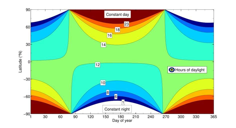 | Keywords: Hours of daylight vs latitude vs day of year.svg A contour plot of the hours of daylight as a function of latitude and day of the year using the most accurate models described in Sunrise equation This SVG is interpreted differently by firefox inkscape and the wikimedia software I provide this SVG version so people can make other versions if they want I also provide my own PNG version for immediate use Own 2010-02-03 Jalanpalmer <span class signature-talk >talk</span> Hours_of_daylight_vs_latitude_vs_day_of_year png Day length Mean meteorological data of the world Meteorological diagrams Astronomical diagrams Contour plots |