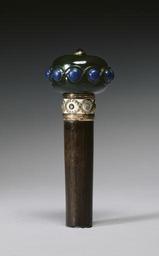 | Keywords: House of FabergĂ© - Cushion-shaped Parasol Handle - Walters 571841.jpg Walters Art Museum artwork Creator House of FabergĂ© A carved guilloché pattern set with polished lapis lazuli stones extends around the circumference of the nephrite pommel Set at its apex is a cabochon sapphire mounted in gold The collar is rimmed in red gold and decorated with entwined green gold garlands applied over an oyster white enamel ground In each of the interstices a rose-cut diamond has been mounted with a crimped flange ca 1900 gold 56 zolotnik enamel diamonds nephrite lapis lazuli sapphires cm 4 4 accession number 57 1841 10015 Henry Walters city Baltimore from the factory Jenny Walters Mrs Warren Delano III New York 1900 by gift Laura F Delano New York date and mode of acquisition unknown Walters Art Museum Gift of Laura F Delano 1950 The FabergĂ© Menagerie The Walters Art Museum Baltimore; Columbus Museum of Art Columbus; Portland Art Museum Portland 2003-2004 Objects of Vertu Precious Works of the Eighteenth Century The Walters Art Gallery Baltimore 1984 FabergĂ© in America The Metropolitan Museum of Art New York; Fine Arts Museums of San Francisco San Francisco; Virginia Museum of Fine Arts Richmond; New Orleans Museum of Art New Orleans; The Cleveland Museum of Art Cleveland 1996-1997 place of origin St Petersburg Russia PD-old-auto 1920 FabergĂ© parasols Collections of the Walters Art Museum |