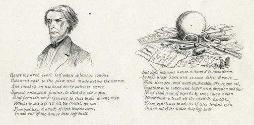 | Keywords: House That Jeff Built p11-12.jpg en Panels from 1863 cartoon The House That Jeff Built by David Claypoole Johnston satirizing Jefferson Davis slavery and the Confederacy Panel 11 a caricature portrait of Jefferson Davis Here ™s the arch rebel Jeff whose infamous course has bro ™t rest to the plow and made active the hearse and invoked on his head every patriots curse spread ruin and famine to stock the slave pen and furnish employment to that thing among men whose trade is to sell all the chattels he can from yearlings to adults of life ™s longest span in and out of the house that Jeff built Panel 12 showing instruments of slavery chains slave auction notices etc lying broken in a pile with a flyer announcing Execution of Jeff Davis the Traitor But Jeff ™s infamous house is doom ™d to come down so says Uncle Sam and so said John Brown ” With slave pen and auction shackles driver and cat together with buyer and seller and breeder and that most loathsome of bipeds by some call ™d a man whose trade is to sell all the chattels he can from yearlings to adults of life ™s longest span in and out of the house that Jeff built 1863-07 1863 cartoon The House That Jeff Built by David Claypoole Johnston David Claypoole Johnston other versions PD-old-70-1923 The House That Jeff Built z Caricatures of Jefferson Davis |