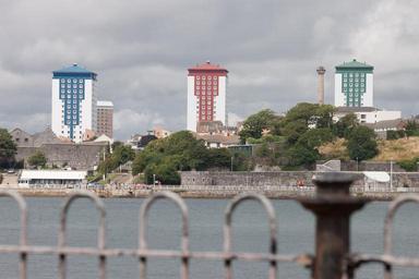 Keywords: housing silos skyscrapers coast architecture blue red green cloudiness iron fence old sea lake england