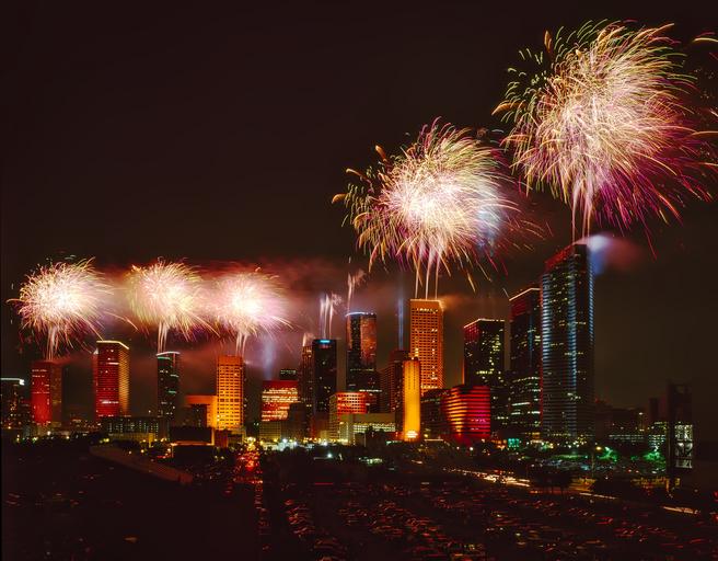 Keywords: houston texas city urban skyscrapers buildings architecture night evening fireworks celebration festive fourth of july hdr reflections silhouettes downtown skyline
