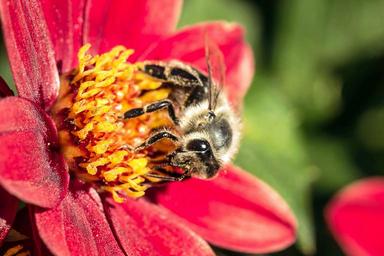 Keywords: hoverfly dung fly insect nectar search collect nectar dahlia mignon-dahlia red animal flower nature