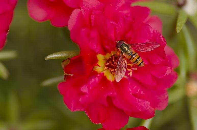 Keywords: hoverfly garden flower red pollen insect close