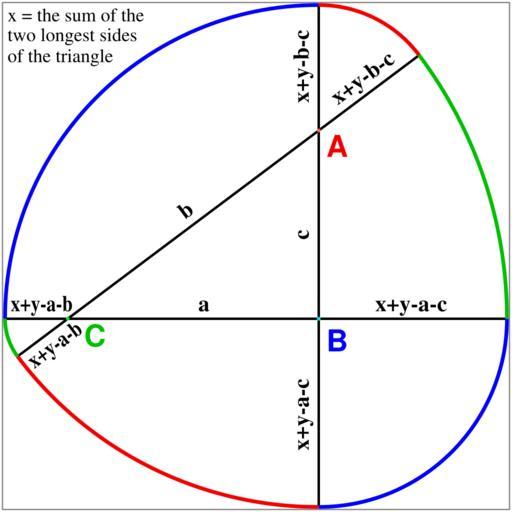 | Keywords: How to make mathematical roller curve based on triangle.svg Diagram showing how to construct a mathematical roller i e constant-width curve based on any triangle In the diagram A B C are the vertices of the triangle while a b c are the lengths of the opposing sides If x is defined as the sum of the lengths of the two longest sides of the triangle while y is an arbitrarily-chosen non-negative padding factor then the constant-width roller curve will be constructed from the following six circular arcs Radius x+y-a centered at A Radius x+y-b-c centered at A Radius x+y-b centered at B Radius x+y-a-c centered at B Radius x+y-c centered at C Radius x+y-a-b centered at C The arcs with two negative terms in the definition of the radius are on the same side of the triangle as the vertices at their centers while the arcs with one negative term in the definition of the radius are on the opposite side of the triangle The overall diameter of constant width of the curve is calculated as the sum of the lengths of the two longest sides of the triangle x plus twice the padding factor 2y minus the length of the shortest side of the triangle The perimeter is pi times the diameter as for a circle If the padding factor y is set at zero then at least one of the arcs will be of zero radius which means that there will be a point of tangent discontinuity where curves join at a vertex of the triangle In the case of an isoceles triangle where the equal angles are less than 60° y 0 means that there will two points of tangent discontinuity while in the case of an equilateral triangle there will be three points of tangent discontinuity i e a Reuleaux triangle In the diagram there is a Pythagorean triangle with sides of relative length 3 4 5 so x 9 while the padding factor is 1 unit i e y 1 This means that there will be circular arcs of radius 5 and 3 centered on the right angle vertex B in the diagram circular arcs of radius 7 and 1 centered on the vertex opposite the shortest side of the triangle C in the diagram and circular arcs of radius 6 and 2 centered on the other vertex A The overall constant diameter is 8 units and the perimeter sum of the length of the six arcs is 8Ï This can be seen from the following calculation proceeding counterclockwise from the top where 36 869898° atan 3/4 and angle is converted to arc length by multiplying it times radius times the radian conversion factor Ï /180 Degrees Radius Arc Length ----- --- ----------- 90 5 2 5pi 36 869898 1 0 20483276pi 53 130102 6 1 77100341pi 90 3 1 5pi 36 869898 7 1 43382935pi 53 130102 2 0 59033447pi ------- Total perimeter 8pi To see a diagram of a constant-width curve based on a 3 4 5 Pythagorean triangle with padding factor y 0 and so with five circular arcs and one tangent discontinuity point see image File Curve of constant width svg This diagram is based on information in the book Mathematical Models by H Martyn Cundy and A P Rollett second edition 1961 Oxford University Press p 211 combined with an adapted version of some of the layout details from PD diagram File Curve of constant width svg Generated from the following vector PostScript source code <pre> 300 396 translate/x 36 869897646 def 2 setlinewidth 150 0 moveto -250 0 lineto stroke 0 -150 moveto 0 250 lineto stroke -240 -30 moveto 80 210 lineto stroke 0 875 1 setrgbcolor 0 0 1 5 0 360 arc closepath fill 0 925 0 setrgbcolor -200 0 1 5 0 360 arc closepath fill 1 4 4 setrgbcolor 0 150 1 5 0 360 arc closepath fill 3 setlinewidth 0 0 8 setrgbcolor 0 0 250 90 180 arc stroke 0 0 150 270 360 arc stroke 0 75 0 setrgbcolor -200 0 50 180 dup x add arc stroke -200 0 350 0 x arc stroke 95 0 0 setrgbcolor 0 150 300 180 x add 270 arc stroke 0 150 100 x 90 arc stroke /Helvetica-bold 24 selectfont 6 129 moveto A show 0 0 8 setrgbcolor 6 -26 moveto B show 0 75 0 setrgbcolor -187 -22 moveto C show 0 setgray/Times-bold 18 selectfont -96 6 moveto a show 45 6 moveto x+y-a-c show gsave 90 rotate -105 8 moveto x+y-a-c show 63 8 moveto c show 172 8 moveto x+y-b-c show grestore gsave x rotate -38 127 moveto b show 114 127 moveto x+y-b-c show /Times-bold15 0 0 18 0 0selectfont -205 5 104 moveto x+y-a-b show grestore /Times-roman 15 selectfont -248 237 moveto x the sum of the show -248 221 25 moveto two longest sides show -248 204 5 moveto of the triangle show /Times-bold15 0 0 18 0 0selectfont -245 5 6 moveto x+y-a-b show 5 setgray 1 setlinewidth -252 252 moveto 404 0 rlineto 0 -404 rlineto -404 0 rlineto closepath stroke showpage EOF</pre> 2010-12 AnonMoos thumb center Curves of constant width Images with PostScript source code Triangle geometry |