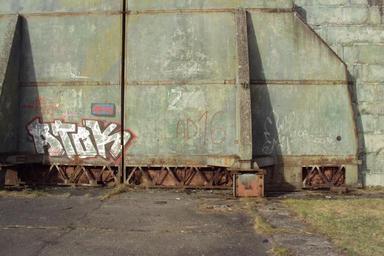 Keywords: Hradčany 5.jpg cs Detail vrat jednoho bunkru na okraji letiště Hradčany own Zákupák 2011-04-08 50 37 19 114 N 14 42 45 266 E region CZ Areál letiště Hradčany