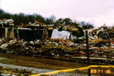 | Keywords: Hsv damage 06.jpg en An overturned Huntsville City Schools maintenance vehicle labels the rubble of Jones Valley Elementary School in Huntsville Alabama which had been a two-story building prior to the November 15 1989 tornado This damage photographed the following day shows that the storm removed the top floor entirely All 37 students who were in the after school program survived because those running the program went directly under the stairs when the power went out not waiting for a tornado warning to be issued One parent outside died in her vehicle http //www al com/news/huntsville/index ssf/2014/11/the_airport_road_tornado_one_o htmlPhotographed by NWS Birmingham during their storm survey Damage from the November 15 1989 tornado to strike Huntsville Alabama photographed by NWS Birmingham during their storm survey 1989-11-16 http //www srh noaa gov/images/bmx/significant_events/1989/11_15/graphics/ C S;O D National Weather Service Birmingham Alabama office other versions PD-USGov 1989 Huntsville Tornado |