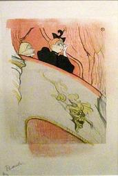 | Keywords: HTLBoxWithGildedMask.png en The Box with the Gilded Mask by Henri de Toulouse-Lautrec 1893 color crayon brush and spatter lithograph On display in Bedford Museum's High Kicks and Low Life exhibition own Simon Speed 2011-01-15 Print out of copyright Toulouse-Lautrec died in 1901 High Kicks and Low Life Exhibition Bedford Museum Photos by Simon Speed Works between 1893 and 1896 by Henri de Toulouse-Lautrec theatre box Theater boxes in art 1893 Theatre audience 1893 | ||||