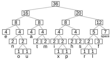 | Keywords: Huffman tree.svg Huffman tree generated from the exact frequencies in the sentence this is an example of a huffman tree It encodes this sentence in 135 bits as 01101010100010111111000101111101000101110001001001001111001111001000111001101 1011110101111010001111101110101110100010111011011000000000 representing about a 53 compression over ASCII's 288 bits not counting any space for representing the tree Notice that the frequencies on each level fall between two adjacent powers of 2 The bit pattern and frequency of each character are shown by the table below Notice that some symbols have different frequencies but the same encoding length; these particularly indicate places where arithmetic coding would do better own 2007-05-15 Dcoetzee <table><tr><td> wikitable Char Freq Code - space 7 111 - a 4 010 - e 4 000 - f 3 1101 - h 2 1010 - i 2 1000 </td><td> wikitable Char Freq Code - m 2 0111 - n 2 0010 - s 2 1011 - t 2 0110 - l 1 11001 - o 1 00110 </td><td valign top > wikitable Char Freq Code - p 1 10011 - r 1 11000 - u 1 00111 - x 1 10010 </td></tr></table> Huffman coding |