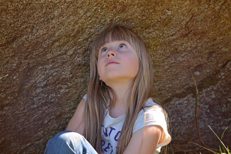 Keywords: human child girl blond long hair face view stone out nature