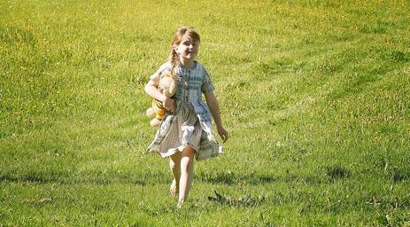 Keywords: human child girl dress meadow nature run happy laugh teddy bear
