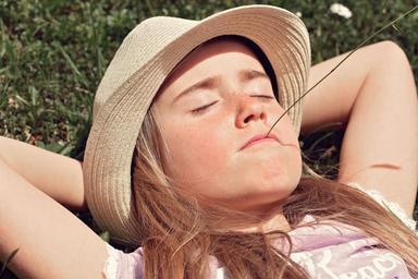 Keywords: human child girl face hat blade of grass relaxed lying meadow rest enjoy nature close
