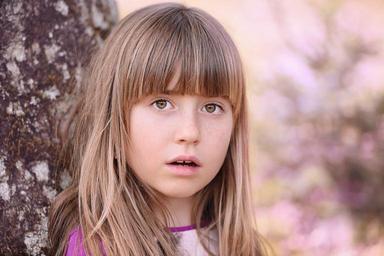 Keywords: human child girl face view blond long hair tree out portrait