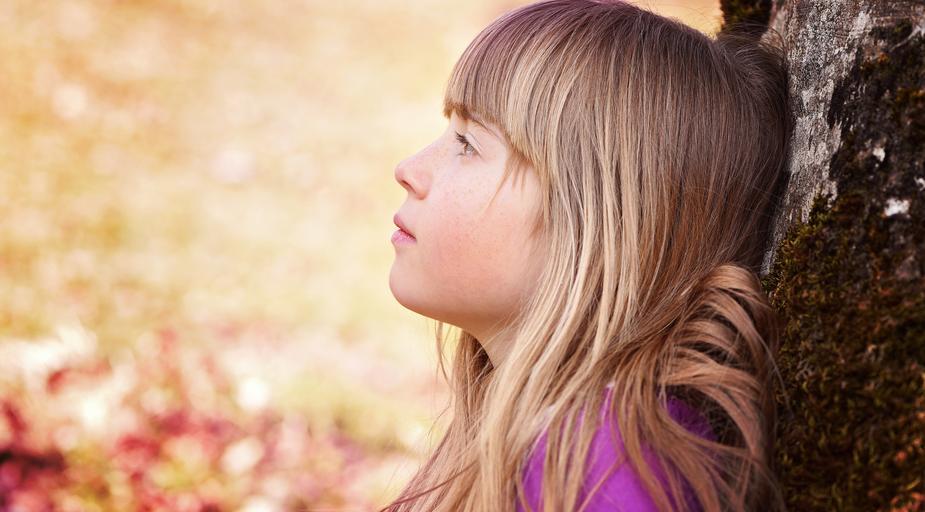 Keywords: human child girl face blond long hair view in thoughts thoughtful tree rest silent out nature close