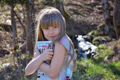 Keywords: human child girl face blond long hair book possession joy out nature portrait