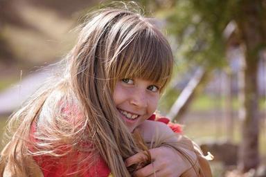 Keywords: human child girl face smile long hair blond view out nature portrait