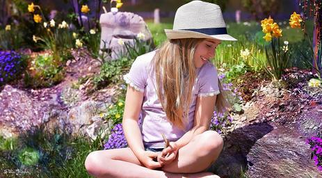 Keywords: human child girl hat long hair face smile out nature sitting painting digital painting
