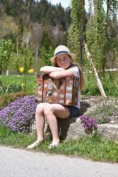 Keywords: human child girl hat luggage barefoot wait nature out portrait