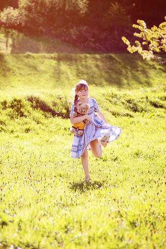 Keywords: human child girl run dress teddy teddy bear meadow nature out