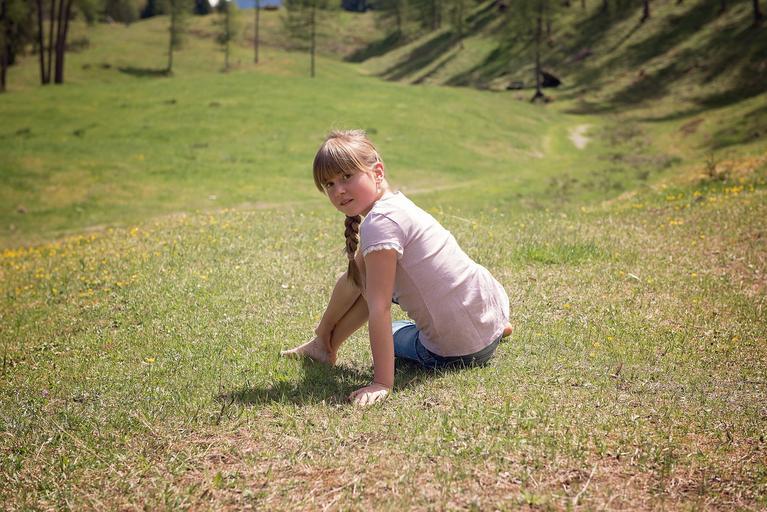 Keywords: human child girl sitting with detent rest meadow nature