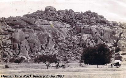 | Keywords: Human Face Rock Bellary.jpg en The South side of the Human Face hill Bellary India 1905-01-01 http //wiki fibis org/index php title File Human_Face_Rock _Bellary jpg Photograph owned by J Macey other versions 15 153534 76 909237 PD-old-70-1923 Hills of Karnataka 1905 in Karnataka Rocks in India |