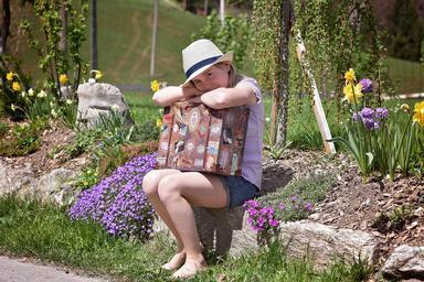 Keywords: human person child girl barefoot hat luggage nature out wait