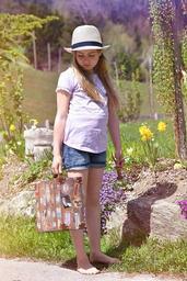 Keywords: human person child girl luggage barefoot hat wait nature out