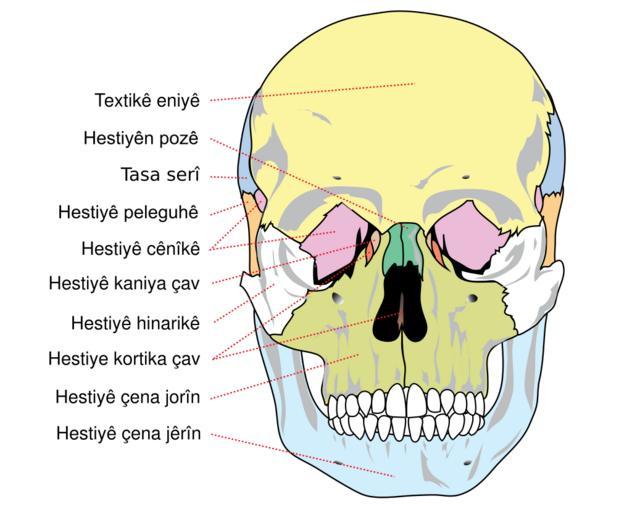 | Keywords: Human skull front bones ku.svg Anatomiya Serî Çavkanî KurmancÃŽ kovar hejmar 3 havîn 1988 the adult skull is normally made up of 22 bones Except for the mandible all of the bones of the skull are joined together by sutures semi-rigid articulations formed by bony ossification the presence of Sharpey's fibres permitting a little flexibility Le crâne humain adulte est constitué de 22 os A l'exeption de la mandibule tous les os du crâne sont reliés entre eux par des sutures articulations semi-rigides formées par ossification La présence des fibres de Sharpey permettent une certaine flexibilité O crânio humano adulto é constituÃdo por 22 ossos à excepção da mandÃbula todos os ossos do crânio encontram-se ligados por suturas articulações semi-rÃgidas formadas por ossificação com a presença de fibras de Sharpey permitindo alguma flexibilidade Human_skull_front_bones svg 2010-08-17 00 00 UTC Human_skull_front_bones svg LadyofHats Mariana Ruiz Villarreal derivative work Alkd <span class signature-talk >talk</span> Human_skull_front_bones svg Original upload log This image is a derivative work of the following images File Human_skull_front_bones svg licensed with PD-user 2007-01-25T11 14 53Z Amada44 695x563 150965 Bytes <nowiki>removed bitmap parts of within the SVG file and replaced by vectors</nowiki> 2007-01-10T15 13 45Z LadyofHats 376x364 323017 Bytes <nowiki>make lines wider</nowiki> 2007-01-10T14 59 43Z LadyofHats 376x364 322794 Bytes <nowiki>outlined text to aboid overlaping</nowiki> 2007-01-10T14 58 21Z LadyofHats 376x364 262824 Bytes <nowiki>fixed version as the side ones</nowiki> 2007-01-06T02 52 11Z LadyofHats 475x434 335789 Bytes <nowiki>corrected typo</nowiki> 2007-01-06T01 48 24Z LadyofHats 475x434 338940 Bytes <nowiki> the adult skull is normally made up of 22 bones Except for the mandible all of the bones of the skull are joined together by sutures semi-rigid articulations formed by bony ossification the pres</nowiki> SVG files on human skull Diagrams in Kurdish |