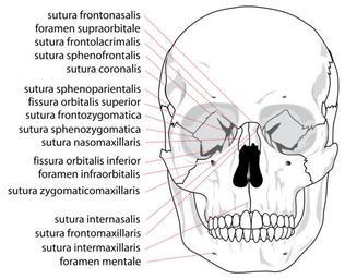 | Keywords: Human skull front suturas.svg the adult skull is normally made up of 22 bones Except for the mandible all of the bones of the skull are joined together by sutures semi-rigid articulations formed by bony ossification the presence of Sharpey's fibres permitting a little flexibility made it myself 2007-01-06 LadyofHats Mariana Ruiz Villarreal LadyofHats <gallery> Image Human skull front suturas numbered svg numbered version Image Human skull front complete svg Image Human skull front bones svg </gallery> SVG files on human skull Cranial sutures |