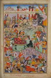 | Keywords: Humayun Receives the Head of Qaracha Khan.jpg en Indian and Himalayan Art Humayun Receives the Head of Qaracha Khan Page from the dispersed manuscript of the first Akbarnama Narrative of the Emperor Akbar by Abu'l Fazl Made in Lahore Punjab Province Pakistan Asia c 1590 Ascribed to Burah Indian active 1580 - 1590 Faces ascribed to Miskin India active 1582 - 1596 Opaque watercolor and gold on paper 14 1/2 x 10 1/16 inches 36 8 x 25 6 cm Currently not on view 1947-49-1 Purchased with the George W B Taylor Fund 1947 Label This page from the first of several illustrated copies of the Akbarnama commissioned by the Emperor Akbar reveals how artists in the imperial Mughal workshop blended indigenous Indian and Persian painting traditions Indian features include the use of bold colors dramatic poses and substantial bodies Persian characteristics include the modulated colors fleshlike rocks forward-tilting picture plane and faces in smooth three-quarter profile Rather than being placed as a caption at the top or back of the page as in works done for Hindu patrons of the time the rectangle of text is placed in the middle of the composition following Persian tradition 1590 http //www philamuseum org/collections/permanent/50344 html mulR 15645 2 Ascribed to Burah Indian active 1580 - 1590 Faces ascribed to Miskin India active 1582 - 1596 PD-Art Uploaded with UploadWizard Akbarnama |