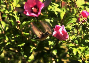Keywords: hummingbird small birds wings brightly-colored iridescent plumage bird iridescent beautiful nature spring summer garden flowers flower fast wings birds and bees fly flying feathers eyes action frozen rose bush rose bloom fragrance beauty