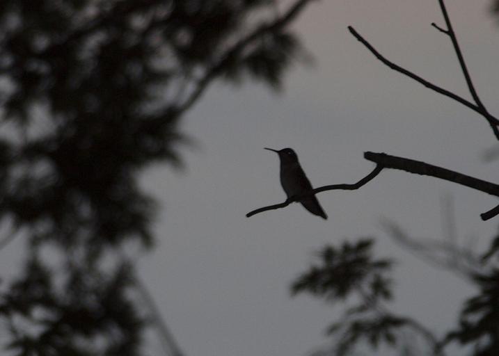 Keywords: hummingbirds birds sitting tree branches dark evening wildlife single one alone sky background leaves plants nature forest silhouette grey
