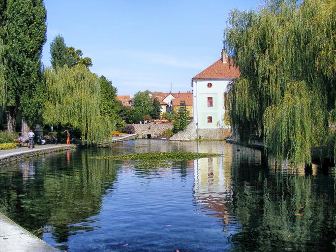 Keywords: hungary buildings village architecture lake pond water reflections trees sky clouds outside summer spring