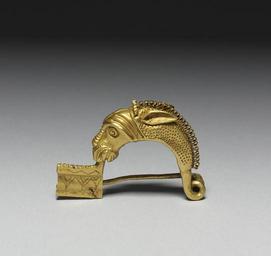 | Keywords: Hunnish - Horse-Head Fibula - Walters 57482.jpg This fibula is shaped like the head and neck of a horse Dots suggest the texture of the coat and looped filigree is used for the mane While the form of the pin was inspired by Roman examples the subject matter the horse relects the importance of these animals to the Huns early Other date century 5 Early Medieval gold cm 2 6 3 7 0 9 accession number 57 482 37476 Joseph Brummer New York date and mode of acquisition unknown Henry Walters city Baltimore Walters Art Museum 1931 by bequest Acquired by Henry Walters 1927 Early Christian and Byzantine Art Baltimore Museum of Art Baltimore 1947 Jewelry - Ancient to Modern The Walters Art Gallery Baltimore 1979-1980 The Allure of Bronze The Walters Art Gallery Baltimore 1995 place of origin southwest Russia Walters Art Museum license Medieval metalwork in the Walters Art Museum Jewellery in the Walters Art Museum Hunnic jewellery Media contributed by the Walters Art Museum needs category review |