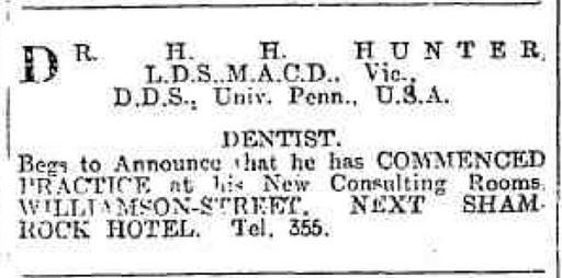 | Keywords: Hunter-(dental surgeon 1908).jpeg en Advertisement of the opening of the dental surgery practice of Herbert Humphreys Hunter 18 November 1881 “ 8 May 1915 L D S Licentiate of Dental Surgery D D S Doctor of Dental Surgery M A C D Member of the Australian College of Dentistry dental surgeon in Bendigo Victoria in 1908 Note that several earlier advertisements displayed D D S Univ Perm http //trove nla gov au/ndp/del/page/9226989 Herbert Humphreys Hunter Public Notices The Bendigo Advertiser Saturday 22 February 1908 p 7 col B PD-Australia Players of Essendon Football Club |