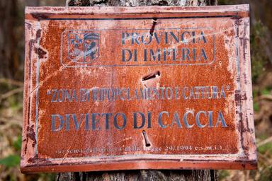 Keywords: hunting prohibited biological recovery nature reserve shield old rusted forest rust scratched fine typography italy